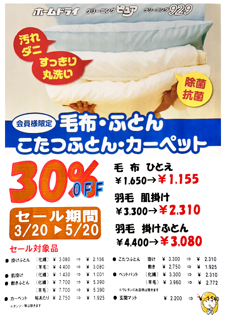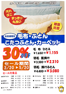 毛布・ふとん・こたつ・カーペットクリーニング30%OFFセール